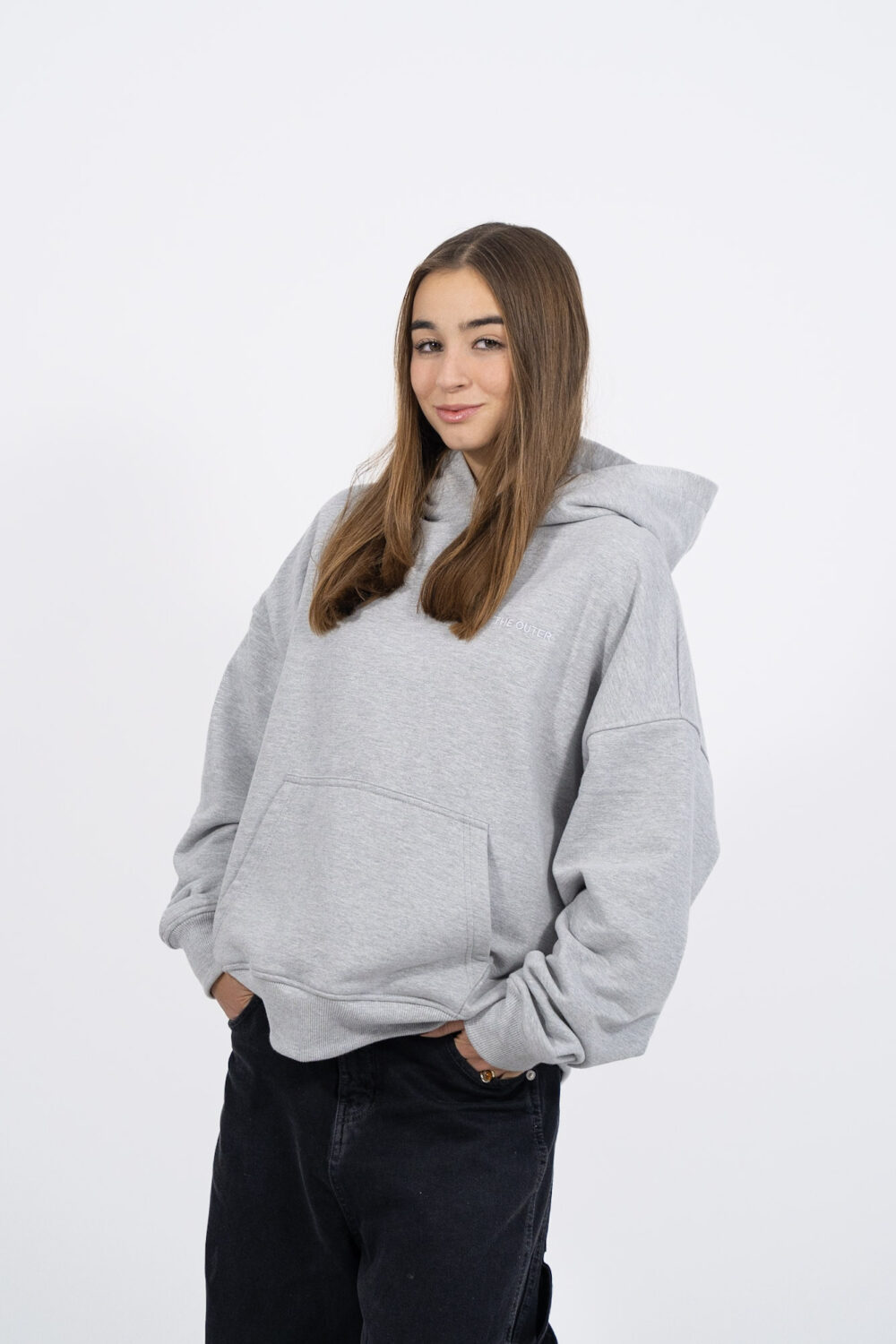Modelka ma 164 cm wzrostu i nosi rozmiar SOversizowa bluza o kroju box. Wykonana z naturalnych włókien bawełny o gramaturze 400 GSM. Wykończona odporną na zmechacenia pętelką.